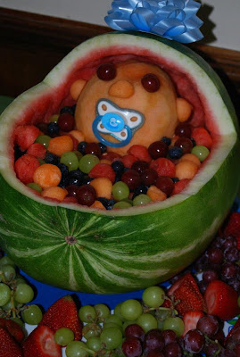 I was also in charge of the fruit salad and for anyone who knows me I can't just go simple for most things so I went on Pinterest and found this adorable picture of a baby in a cradle fruit salad. Here was my early morning attempt and I have to say it came out stinkin cute!